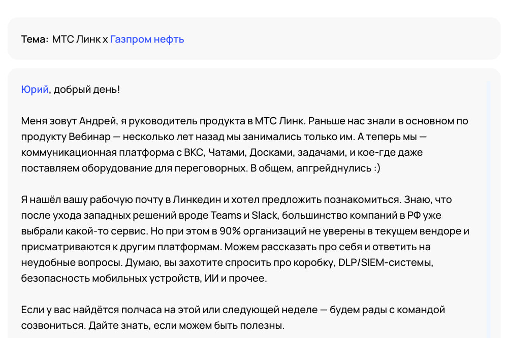 Например, мы помогли запустить аутрич компании МТС Линк. Мы сосредоточились на очень узкой и редкой аудитории: СТО российских компаний с 1 000+ сотрудников. Таких лидов совсем немного (получилось найти 658), но они были максимально целевыми для МТС Линк, которые продают коммуникационную платформу для крупного бизнеса. СТО — их главный ЛПР. В результате, мы получил 13% ответов, а отвечали такие компании как Авито, Райффайзен, Альфа-Банк, Северсталь и пр.