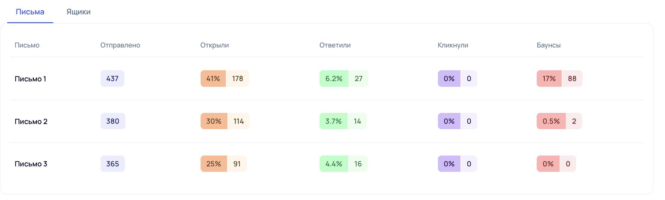 В процессе отправки писем здоровье почт не падало ниже 95%, что супер крутой результат для только недавно созданных ящиков. Более того, из-за ограничения по срокам мы потратили всего 1 неделю на прогрев, вместо 2-3 рекомендованных. Однако, ставка сработала и доставляемость была отличная. Не рекомендуем повторять это самостоятельно, по крайней мере пока :)