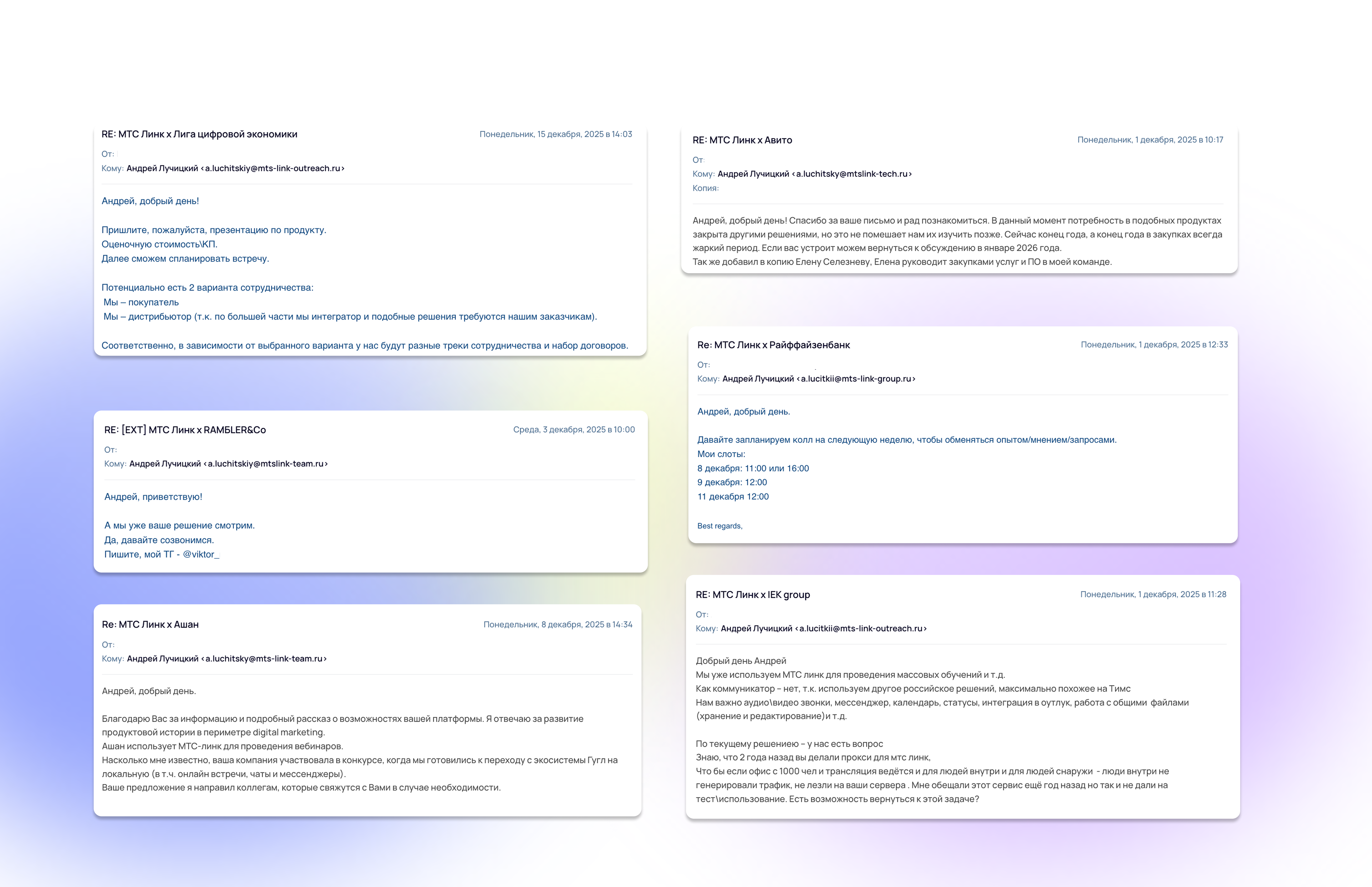 Но, с другой стороны, популярность МТС Линк ставит и некоторые ограничения на аутрич, в первую очередь на базу. Компания коммуницирует или уже работает практически со всем отечественным рынком, и очень сложно подыскать базу клиентов, куда можно зайти с предложением. Второе ограничение — в меру сдержанный стиль письма. При таких масштабах компании, как у МТС Линк, любое действие влияет на репутацию бренда.